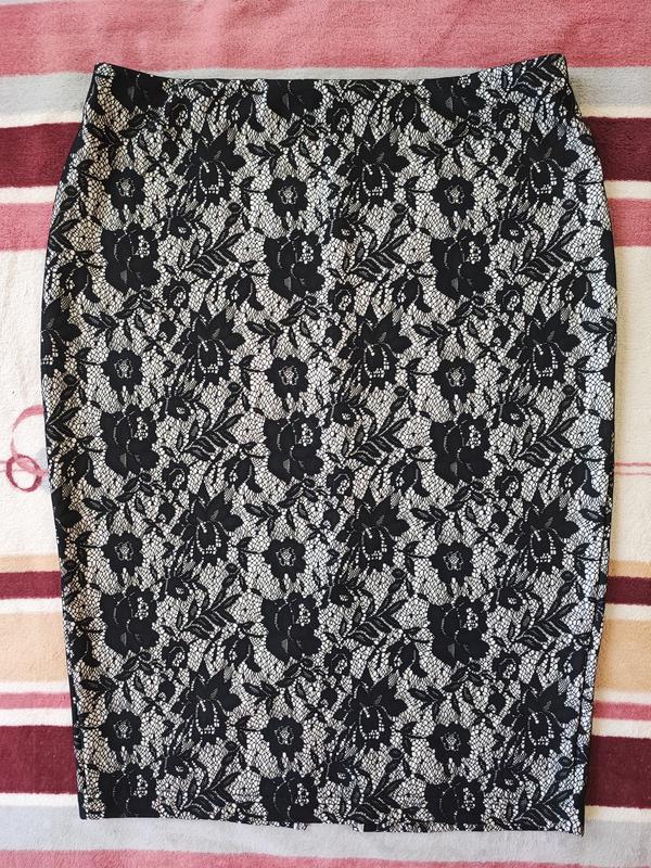 Шикарная трикотажная юбка-карандаш с имитацией кружева. Сзади шлица, длина чуть ниже колена. В поясе на резинке. Ткань плотная, не просвечивает, слегка тянется. Эффектно смотрится, идеально садится по фигуре. Состояние новой вещи без дефектов.