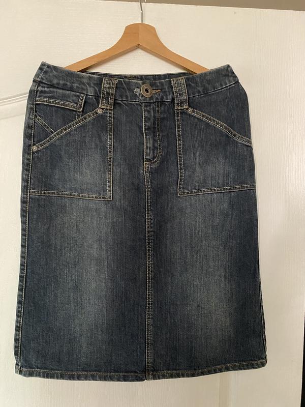 Джинсова спідниця в довжину міді. прямого крою. з карманами та розміром позаду. розмір 40/...