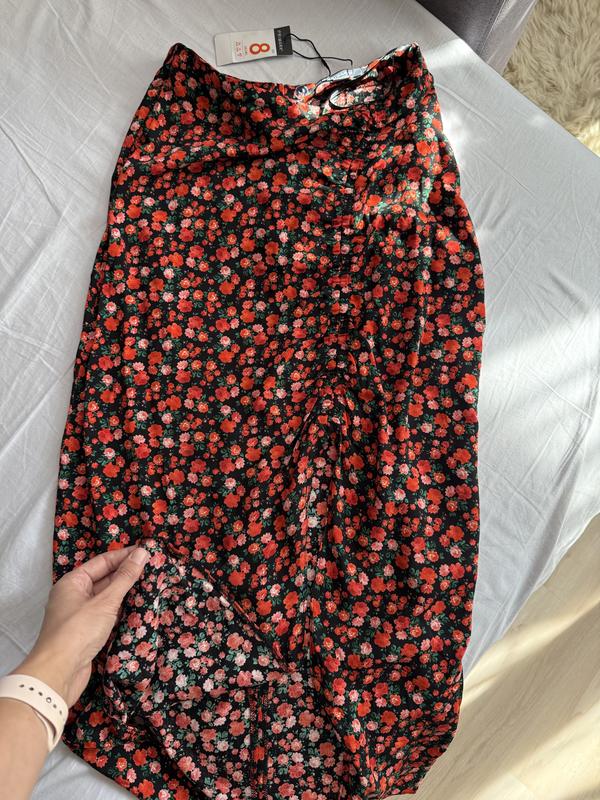 Нова спідниця, в квітковий принт, дрібні троянди. Розмір 8, на XS-S, 100% віскоза. Розріз на ніжці з оборками. Застібається на блискавку і ґудзик. Заміри: Довжина: 85 см Пів обхват талії: 34 см Пів обхват стегон: 46 см Висота розрізу: 46 см