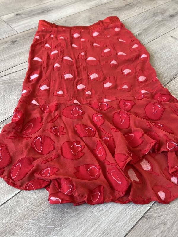 Вінтажна спідниця Nina Ricci, схожа на подіумну річ. Дуже гарні деталі, низ асиметричний, з одного боку повністю застігається на корсетні гачки, з іншого є внутрішня кишенька. Матеріал шовк, а поверх аплікації з квітів. Неймовірно гарна річ. Стан чудовий, є декілька зачіпок, які на тілі не помітно. Внутрішня бірка частково зрізана, але те що це шовк немає сумнівів. На розмір S-M. Заміри: пот 35, поб 44, довжина посередині 75.