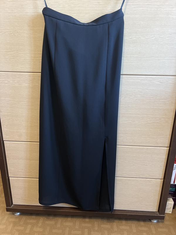 Тканина типу шифон, не мнеться. Є коротка підкладка. На блискавці і резинках. Заміри: ПОТ 35-37 ПОС 50 РОЗРІЗ 40 ДОВЖИНА 92