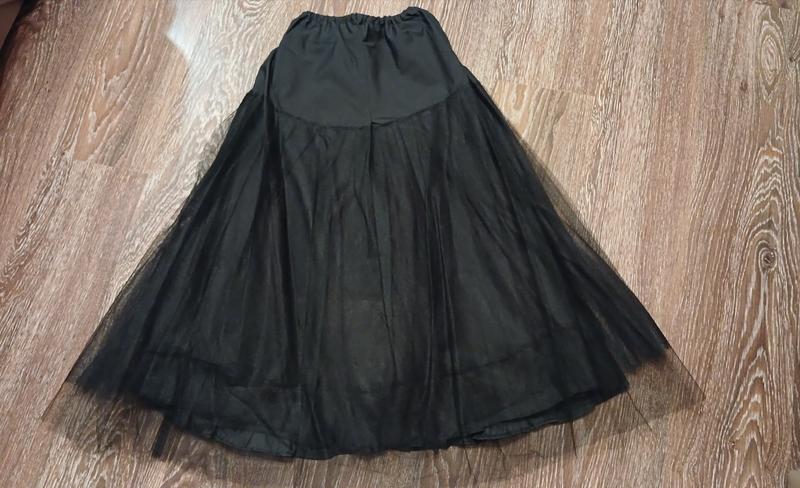 Юбка женская, черного цвета, конической формы; имеет два слоя фатина для создания объема от линии бедер до низа. Размер S (ширина талии в стянутом состоянии - 27 см), длина - 85 см. Основа - поплин. По низу основной юбки обработана волан для создания дополнительного объема. Юбка без застежки - на эластичной тесьме в кулиске. Юбку можно использовать как нижнюю юбку для платья, так и элемент наряда на Хэллоуин. Всесезон. Без дефектов.
