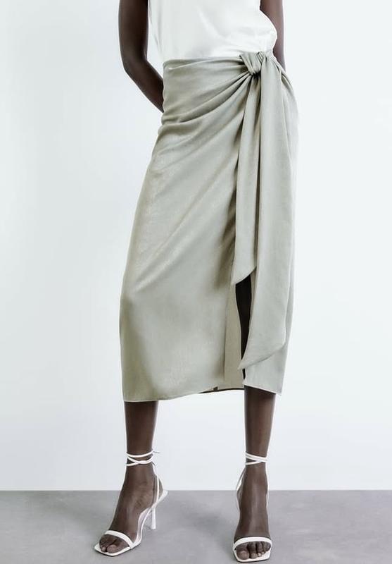 Спідниця з високою талією та вузлом спереду. Розріз спереду по низу. Прихована блискавка ззаду. ЗОВНІШНІЙ МАТЕРИАЛ 100% поліестер. Стан відмінний колір олива з сірим відтінком