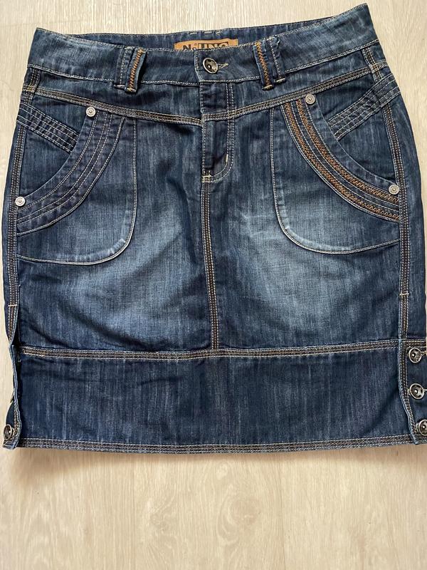 Джинсова спідниця в довжину міді. Прямого крою,з карманами по переду та заду. Ґудзики по низу,в бокових швах. Розмір 40/L/48