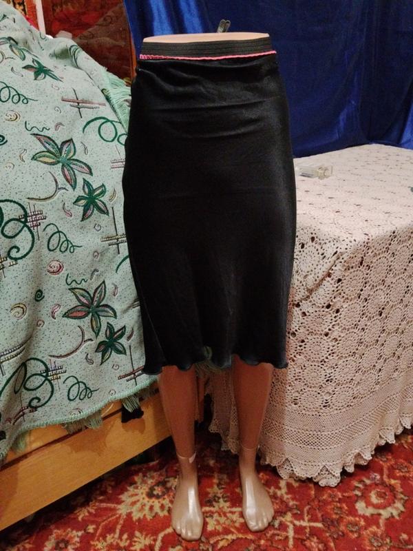 очень красивая черная юбка в боевом стиле.Ткань напоминает вискоз, понятная к телу и тянется.Размер м,л,хл. опис состояние очень хорошее длина 69 пояс и пот 40 ширина бедер 53