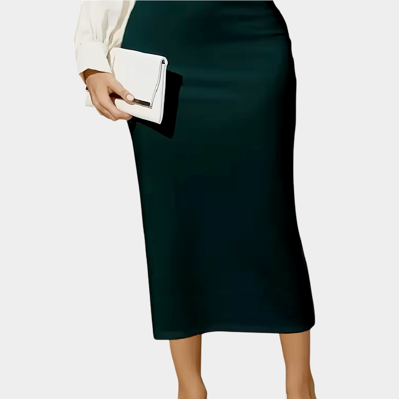 Юбка из плотного трикотажа тёмно зелёного цвета. Универсальный пояс на резинке. Сзади шлица. Полуобъём талии от 49 до 69 Полуобъём бедер от 68 до 78 Длина 92