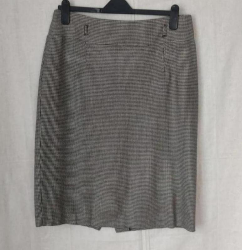 Деловая юбка - карандаш со стильным принтом "гусиная лапка" с завышенной талией, на поясе лямки для пояска; сзади разрез и потайной замочек; на шелковом подкладе; известного британского бренда Marks & Spencer. Замеры: длина-67, высота пояса-8; полуобхват бедер-57; обхват пояса-90. Размер 79-14(48)