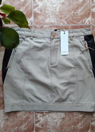 Стильна фірмова спідниця міді зі вставками з шкір.заступника. Має 2 кишені на блискавці спереду і 2 прорізних ззаду. Без підкладки. Відмінне лекало. Дуже класно виглядає! Стрункий, за рахунок чорних вставок на стегнах. Склад: 100% котон. Колір: беж. Розмір: 40(L). Заміри : ПІТ 43-43,5 ПОБІДИ 51 довжина по боковому шву 43. Дивіться багато інших фірмових спідниць в моїх оголошеннях.