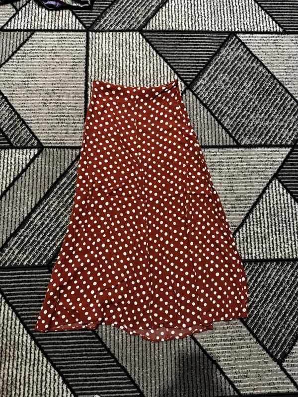 Спідниця колір як на другому фото, в горошок. Гарно розвіюється як крутишся. 100%віскоза. Довжина 82см