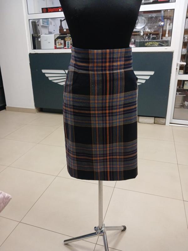 юбка-карандаш с завышенной талией в клетку выполнена в классическом фасоне с узором в серо-черную и оранжевую клетку. размер 48-50. вискоза, полиэстер длина 60см талия 79см стегна 99 см 77/1