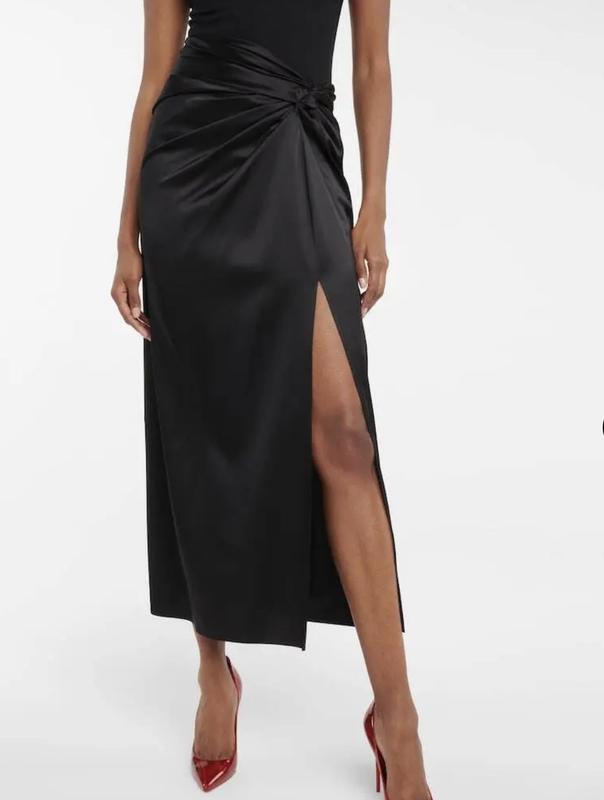 Чорна спідниця-міді від Magda Butrym зав'язана вузлом на стегні, що природно підкреслює вигини тіла. Глибокий розріз на нозі що регулюється на кнопці Спідниця-міді Magda Butrym із еластичного шовкового атласу зі збірками.