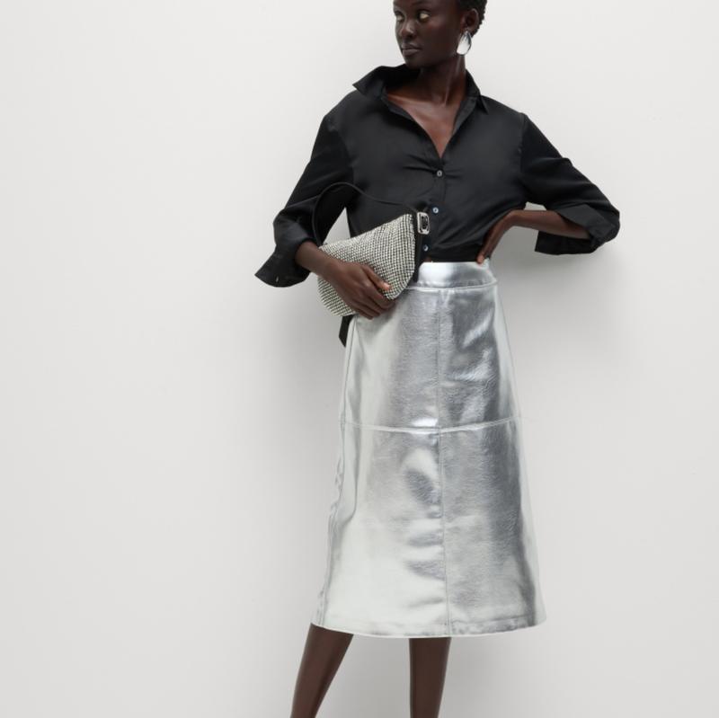 Стильна спідниця з якісної екошкіри в елегантному срібному кольорі. Актуальна, зручна та вишукана — ідеальний вибір як для свята, так і для повсякденного образу. Довжина міді та металевий ефект додає вишуканості Глибокий розріз Виміри : ПП 52 ПС 64 Довжина 77 Розріз 32