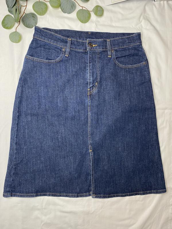 Блакитна джинсова спідниця А-силуету з розрізом спереду.Вона має класичні джинсові деталі :пʼять кишень,ширіньку на блискавці та ґудзик на поясі.Такий фасон вважається універсальним Розмір по бірці 29 НОТ-39 НОБ-48 Довжина-62 93%бавовна 5%поліестер 2%еластан