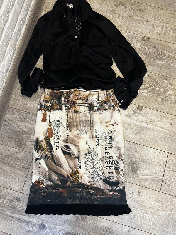 Ефектна дизайнерська спідниця від преміального бренду Marc Cain. Оригінальний авторський принт з написами та графікою — виглядає стильно й дорого. Прямий крій, комфортна посадка, приємна до тіла тканина. Універсальна довжина — легко поєднується з базовими блузами, гольфами або жакетами. Ідеальний варіант для міських та офісних образів.