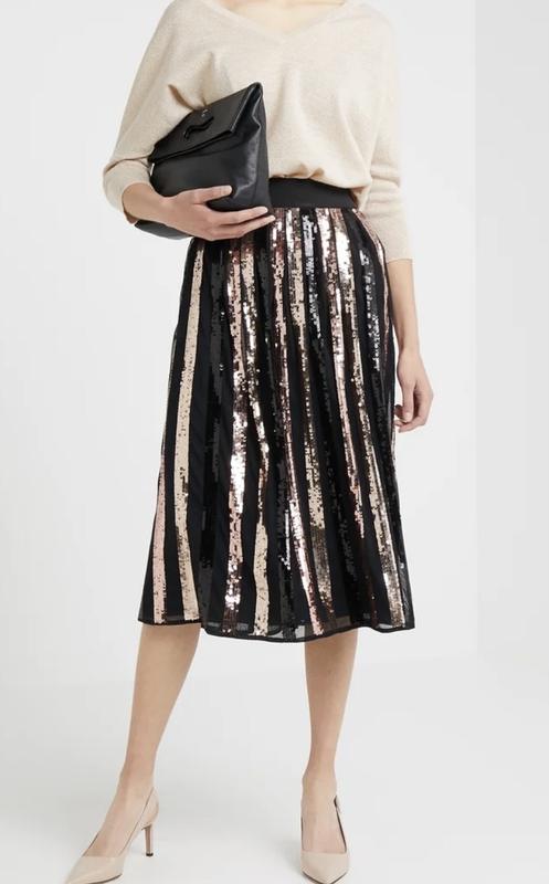 Жіноча спідниця міді – ідеальний варіант для свят, особливо для Нового року! ✨ Стильна, яскрава, з неперевершеною грою паєток, які виконані дуже ретельно та стильно. • Розмір: 38 (дивіться по замірах) • Талія: на широкій резинці, 36 см • Довжина: 77 см • Особливості: є підклад, збоку замочок • Стан: абсолютно нова Цю красу словами не передати – спідниця ідеальна як для святкових образів, так і для особливих буденних моментів.