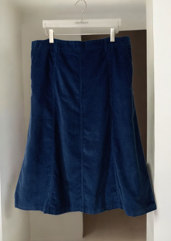 Юбка вельветовая расклешенная к низу. Имеются вертикальные швы, боковые внутренние карманы. Сзади, в поясе резинка. Цвет синий. Размер указан UK 18, EUR 46. ✔️ ПОТ 46/51 ✔️ ПОБ 62 ✔️ ширина по низу 88 ✔️ длина 84 Юбка новая, без бумажной бирки.