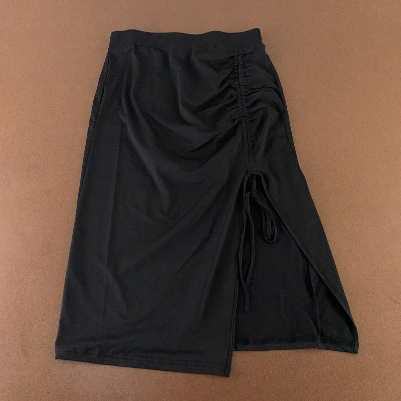 Черная миди от Shein, которая добавляет уверенности. Высокий разрез красиво открывает ножку при ходьбе, а сборка сбоку добавляет образу динамики. Ткань хорошо тянется, садится четко по фигуре. Размер M (38).