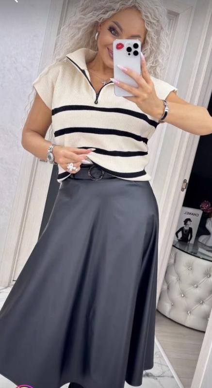 Довжина 83 см. На обхват стегон плюс мінус 110. Нова, не ношена. Причина продажу - мені не пасує фасон