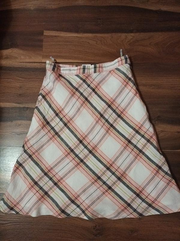 хорошего качества. Второе фото показывает что в боковом шве клетка совпадает. Это говорит о качестве пошива. Полуохват талии 41 см Длина 69 см Полуохват бедер 54 см.