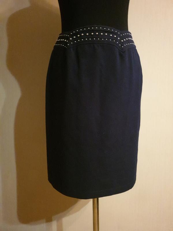 Стильная темно-синяя юбка-карандаш от элитного бренда Escada имеет изысканный дизайн с акцентным поясом, декорированным несколькими рядами металлических заклепок. Модель изготовлена в Германии из высококачественной плотной ткани (95% хлопок, 5% эластан), что обеспечивает идеальную посадку по фигуре и комфорт в течение всего дня. Юбка застегивается на скрытую молнию сзади, сочетая в себе классическую элегантность и современные рок-н-рольные нотки. Замеры: пот- 37 поб- 50 длина - 55 указан размер - 36