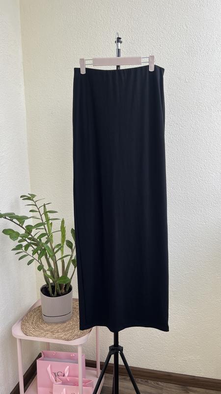 Трикотажна спідниця у довжині максі з розрізом ззаду на поясі резинка, матеріал тягнеться Заміри: талія 36-46 см бедра 47-56 см довжина 105 см розріз 55 см