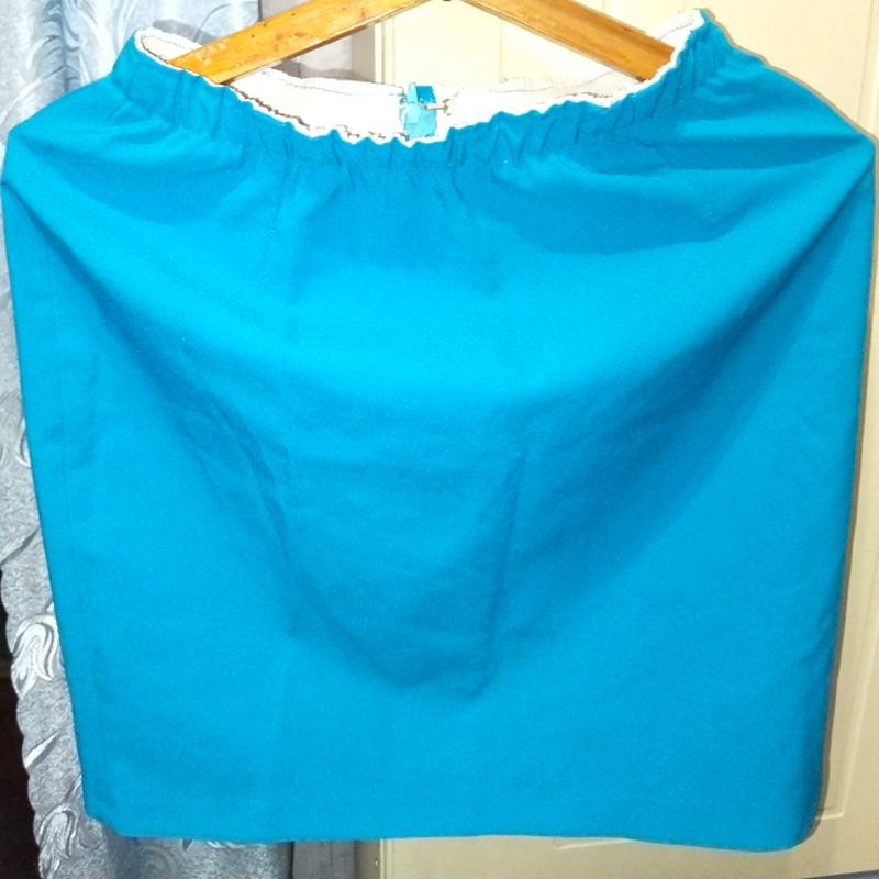 Длина по колено, не приталенная, "карандаш". очень насыщенный голубой цвет.