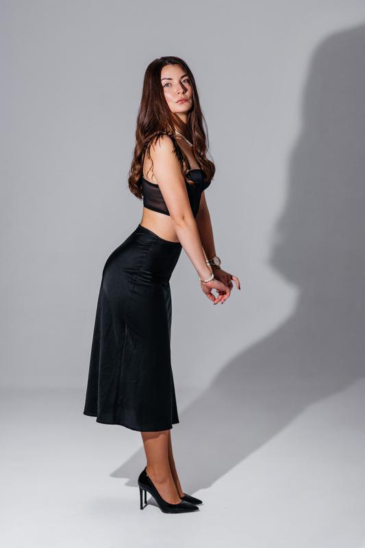 Чорна спідниця міді на резинці. Стан чудовий, вдягала на фотосесію. Тканина тонка, легка, трішки просвічує, на фото видно. Бренд невідомий, купляла на Rozetka Заміри додала на фото Склад поліестер