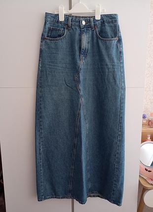довгу джинсову спідницю-міді. Довжина 99-100см ПО пояс 36-37см ПО бедра 47-48 Деталі: Вона має високу посадку, застібку на ґудзик та блискавку, а також кишені, Особливості: Присутній центральний вертикальний шов позаду,, який закінчується розрізом.