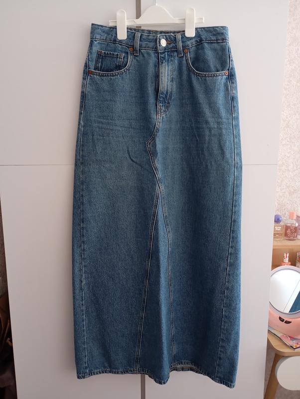 длинная джинсовая юбка-миди. Длина 99-100см По поясу 36-37см ПО бедра 47-48 Детали: Она имеет высокую посадку, застежку на пуговицу и молнию, а также карманы, Особенности: Присутствующий центральный вертикальный шов сзади, который заканчивается разрезом.