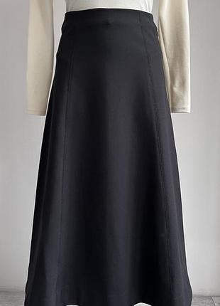 Чорна спідниця А-силуету із щільного трикотажу 68% віскоза, 29% поліестер, 3% еластан Нова Розмір ХС Півобхват талії - 33 см Півобхват стегон - 48 см Довжина - 81 см