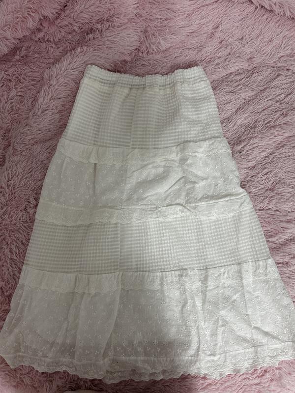 Біла літня спідниця міді. Напівобʼєм талії 33см, тягнеться до 41см. З підкладкою. Має один шов ззаду