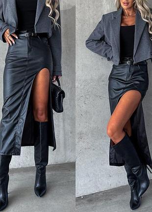 Стильна спідниця, з вирізом на ніжку. Еко шкіра. Стан : ідеальний Розмір 42-44