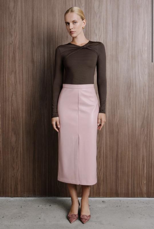Пудровая прямая юбка миди из экокожи Никаких дефектов, дополнительные фото пришлю 34 размер Цена на сайте 2399