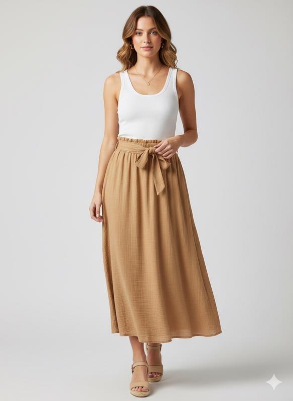 Спідниця міді/максі (колір кемел) • Розмір: M–L • Стан: Нова (зі стікерами, без паперових бірок) • Довжина: 84 см • Талія: 38 см (тягнеться до 60 см) • Деталі: Еластичний пояс-жатка, декоративний бант.