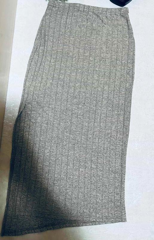 длинная юбка в рубчик серого цвета срез по низу асимметричный сбоку разрез
