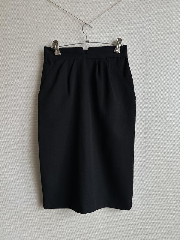 Спідниця-олівець-тюльпан. З щільної тканини, яка добре тримає форму, пояс має виріз. Складки у пояса роблять спідницю похожою на тюльпан. Є бокові кармани, розріз ззаду і підкладку. В складі тканини є вовна ПОТ 33 ПОБ 49 Довжина 63