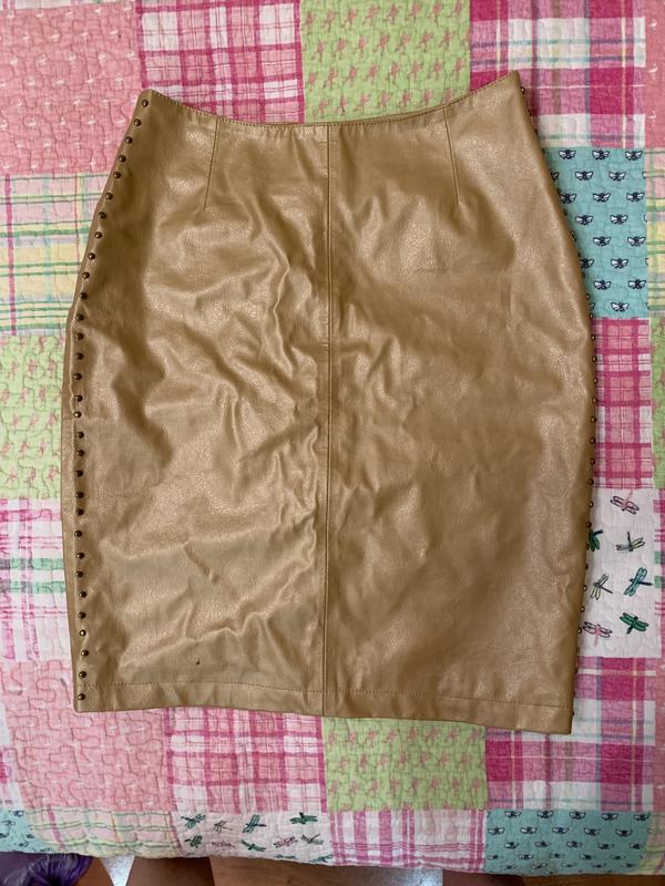 Золотистого цвета, искусственная кожа,с камнями по бокам ,С подкладкой. Хорошего пошива. Талия 80 Бедра 92 Длина 51