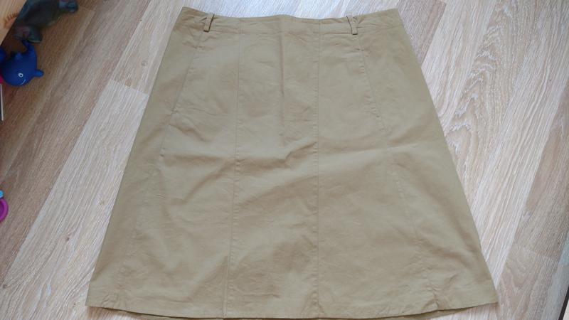 Очень классная юбка трапеция, длина выше колена, впереди карманы в швах. Цвет как на фото, очень красивый оттенок оливкового, ближе к горчичному.