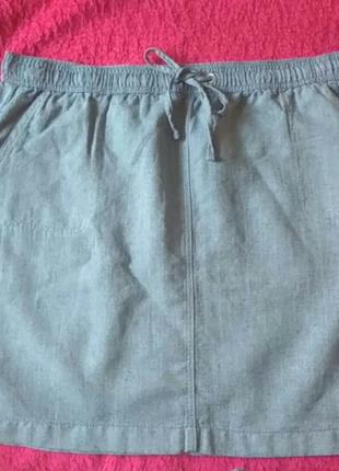 Спідниця спортивного стилю, з боків кишені, талія на резинці. Склад натуральний - льон, бавовна. Довжина 53,талія 52,побіди 66
