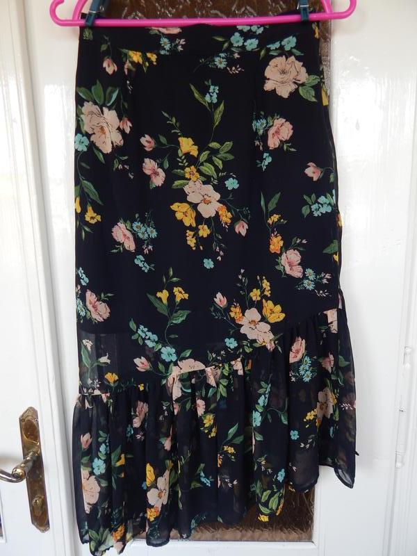 ПОТ 33-34см, ПОБ 44-45см, довжина з правого боку юбки 66 см, з лівого 80см, ширина волана 27см