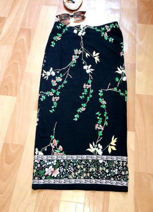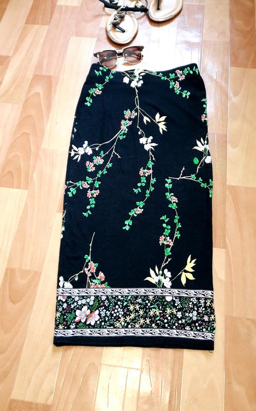 Крута віскозна спідничка міді в квіти, розмір вказано ХС(6), гарно сяде на С(8). Талія на резинці, півобхват 32 см, тягнеться до 42 см, півобхват бедер 38-48 см, довжина 75 см. Тканина гарно тягнеться, не просвічується.