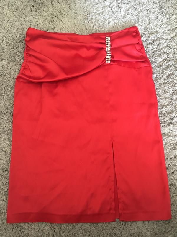 Червона атласна спідниця. Стан нової, не вистачає одного камінчика.Розмір С.Красива розпорка на лівому коліні.