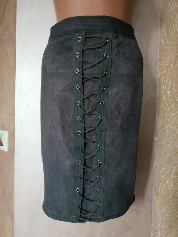 Классная юбка из экозамша. Есть дефект - на фото слабо видно, но выгор более широкая шнуровка местами. Моделька - юбка карандаш. Длина до колен. Спереди шнуровка (шнур-реринка). Состав: 95% полиэстр, 5% эластан. Качество отличное, изнанка тоже как замш. Серая: M\L. Длина по боковому шву 54 Полуобхват в поясе 36,5 тянется до 56 Полуобхват в районе бедер 44 тянется к 65 Полуобхват по низу 40, тянется до 58 Цена серой 420-40%=252грн. есть другие цвета, без дефектов. Отправляем: Новая почта - каждый день практически. Укр. почта - в течение 1-3 дней. Розетка по договоренности.