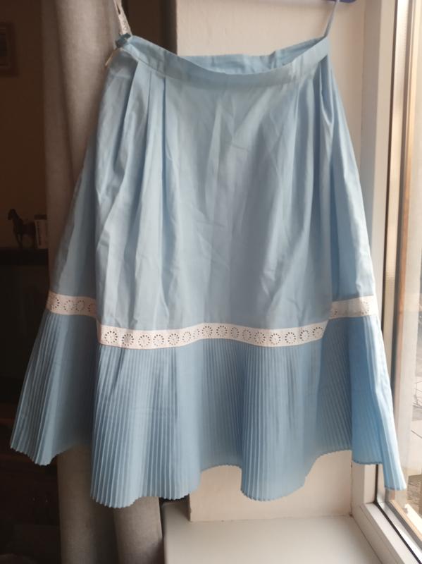 Тонка літня спідниця.Колір голубий насичений,як на третьому фото.Збоку замочок.Довжина 65см.Ширина в талії 33,5см.В бедрах вільна.
