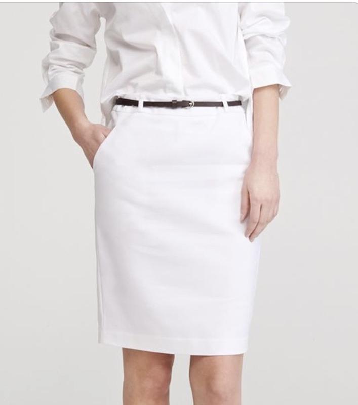 Біла спідничка до коліна прямого крою (олівець) з високою талією та боковими кишенями і коричневим пояском із штучної шкіри, котонова.