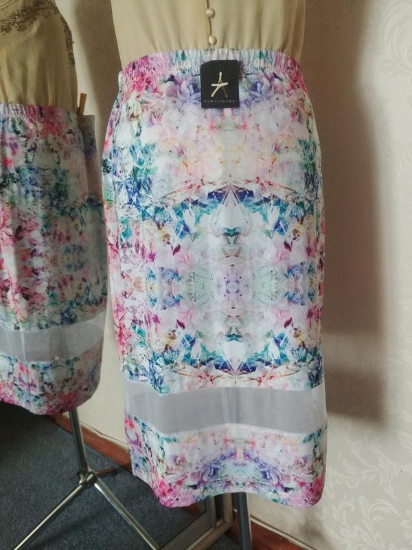 Atmosphere. Новая летняя юбка карандаш p.14. L. Без подкладки, материал типа масло. Не светит. Модель карандаш, на резинке. Сетчатая Вставка. Материал тянется Длина 69 ПОТ 42 ПОСтегон 53