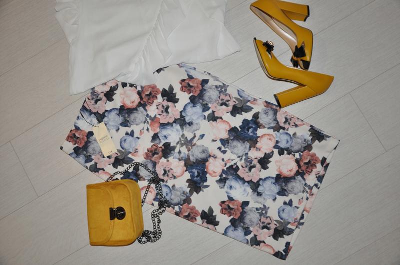 Фірмова спідниця Papaya. Красивий квітковий принт. Тканина тягнеться. Розмір: 8, заміри напівобхват пояси - 34 см, напівобхват стегон - 42 см, довжина - 71 см)