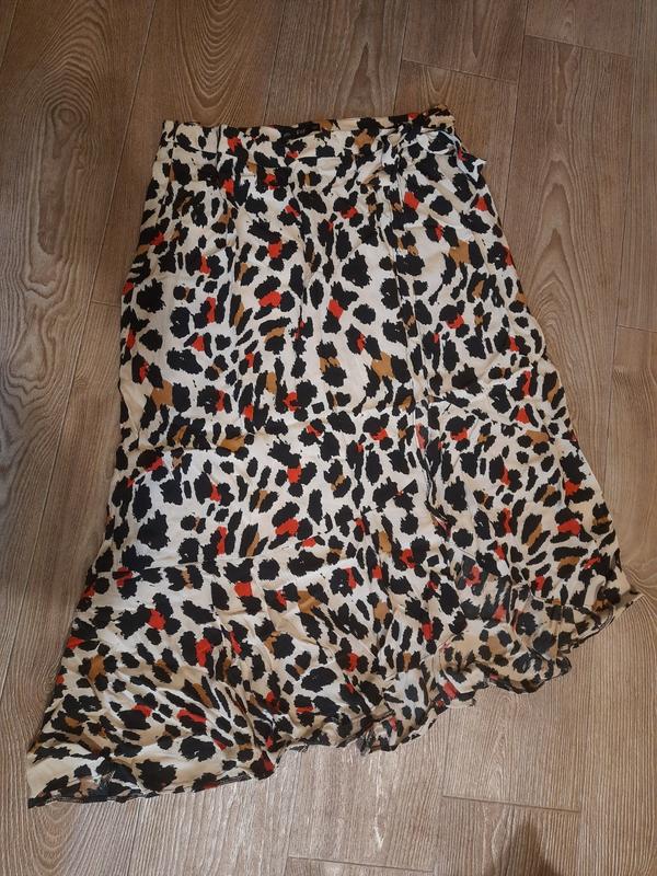 Очень красивая юбка в отличный принт и с воланом по низу. Есть разрез спереди слева. продаю так как есть такая же только больше. эта уже запала. Она очень классная. у меня точно такая есть в большем размере,роны летом с босоножками а весной и осенью с высокими сапогами, выглядит шикарно. Длина по уду 83, спереди по разрезу 68, талия 40