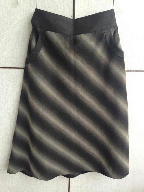 Юбка из плотной костюмной ткани приятной мягкой структуры .На ацетатном подкладе. Высокая талия . Цвет более насыщенный ,темнозеленые полосы чередуются с хаки .Замеры : ПОТ - 32 см , длина -68 см , высота пояса - 7 см . Состав -78 % - полиэстер , 22% - вискоза .
