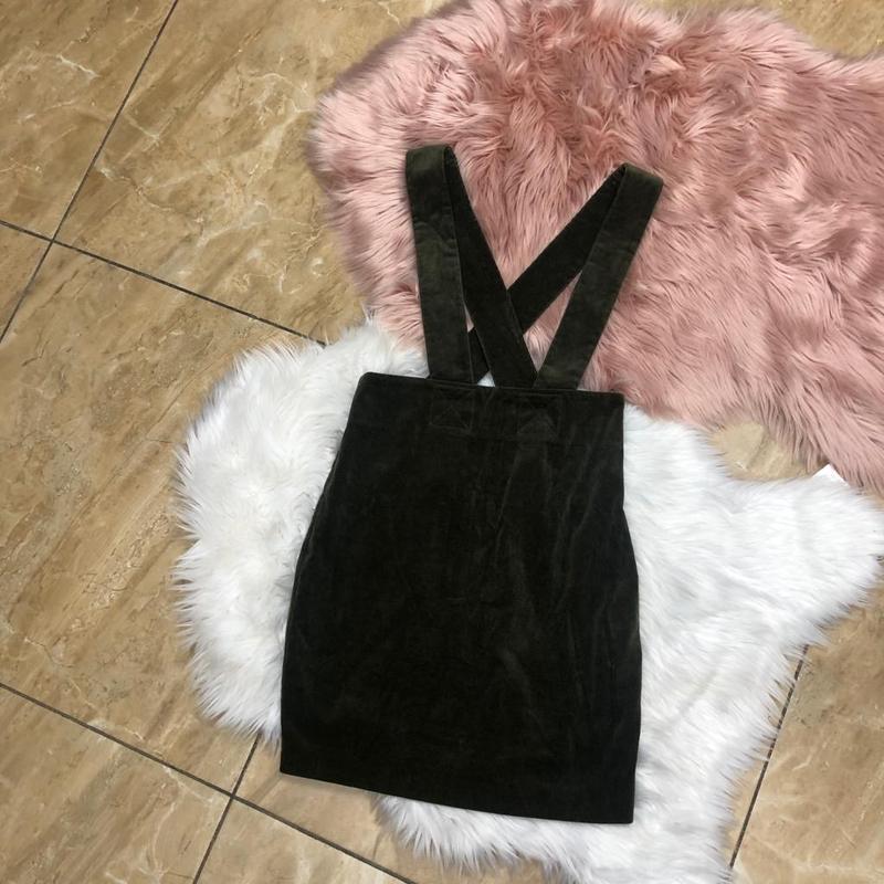 Спідниця з бретелями оливкового кольору.Розмір М. Матеріал вельвет. Висока талія. ПІТ-39, ПОБІДИ-47, довжина-53.